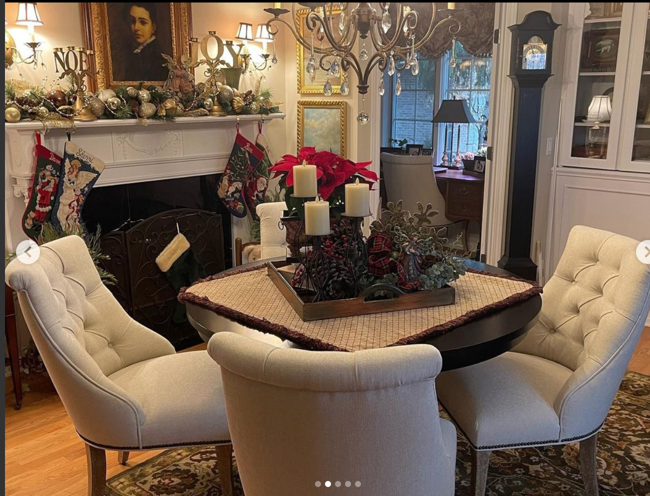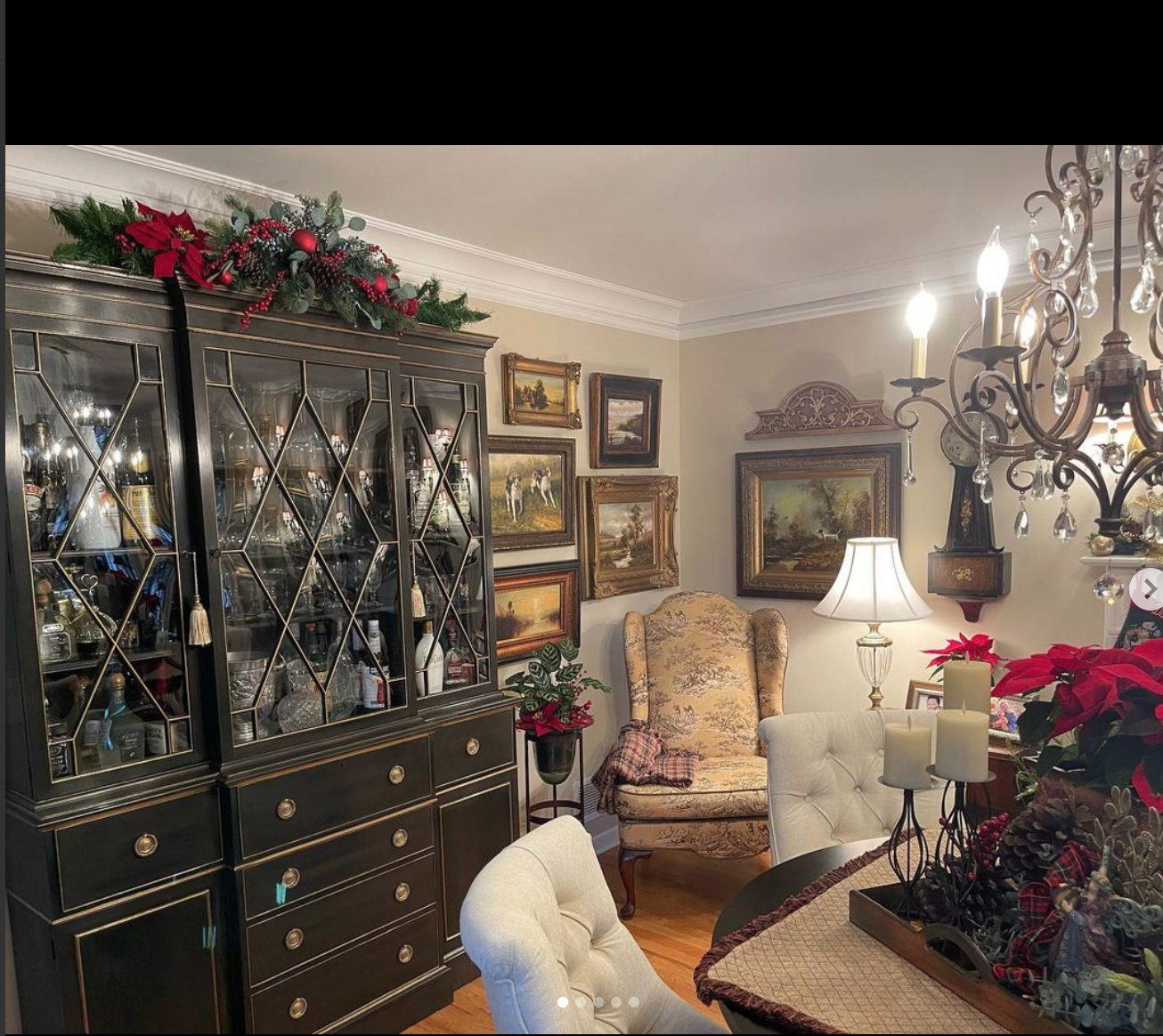 I am ALL ABOUT rescuing old things and surrounding myself with objects that have a story and a past — (and, ok, I DO love a deal!) … Liquor cabinet: purchased at a charity shop for $195 and painted (oil-based enamel) • Off-white chairs: 5 purchased for $125 from FB Marketplace; recovered, tufted & nailhead trim added • Chandelier: FB Marketplace, $90 • Wingback Chair: inherited and recovered with designer hunting dog fabric remnant (back and sides had to be done in a different fabric) • Round Black Table: Wayfair purchase! • Club Chairs: Snagged from a friend’s ( @paulapetersenborchardt ) garage (!); reupholstered (the bolster pillows are embroidered with my grandmothers’ initials 😢❤️) • Old Plate Rack: spray-painted flat black (thanks, @rinkerphotography !) • Leather-topped Rectangular Table & Lamp (vintage finds): FB Marketplace