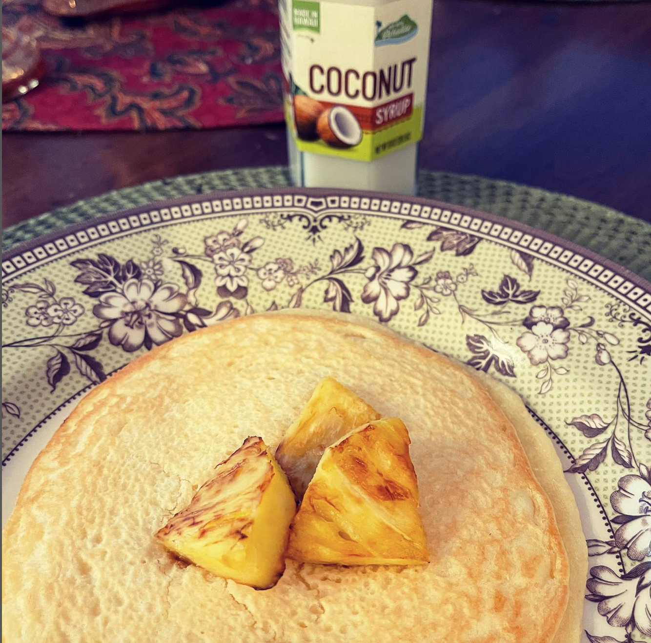Mochi pancakes with grilled pineapple and coconut syrup. 🌴 Best eaten outdoors, under a palm tree. But, you know, it’s 16° F here… 🤷🏻‍♀️