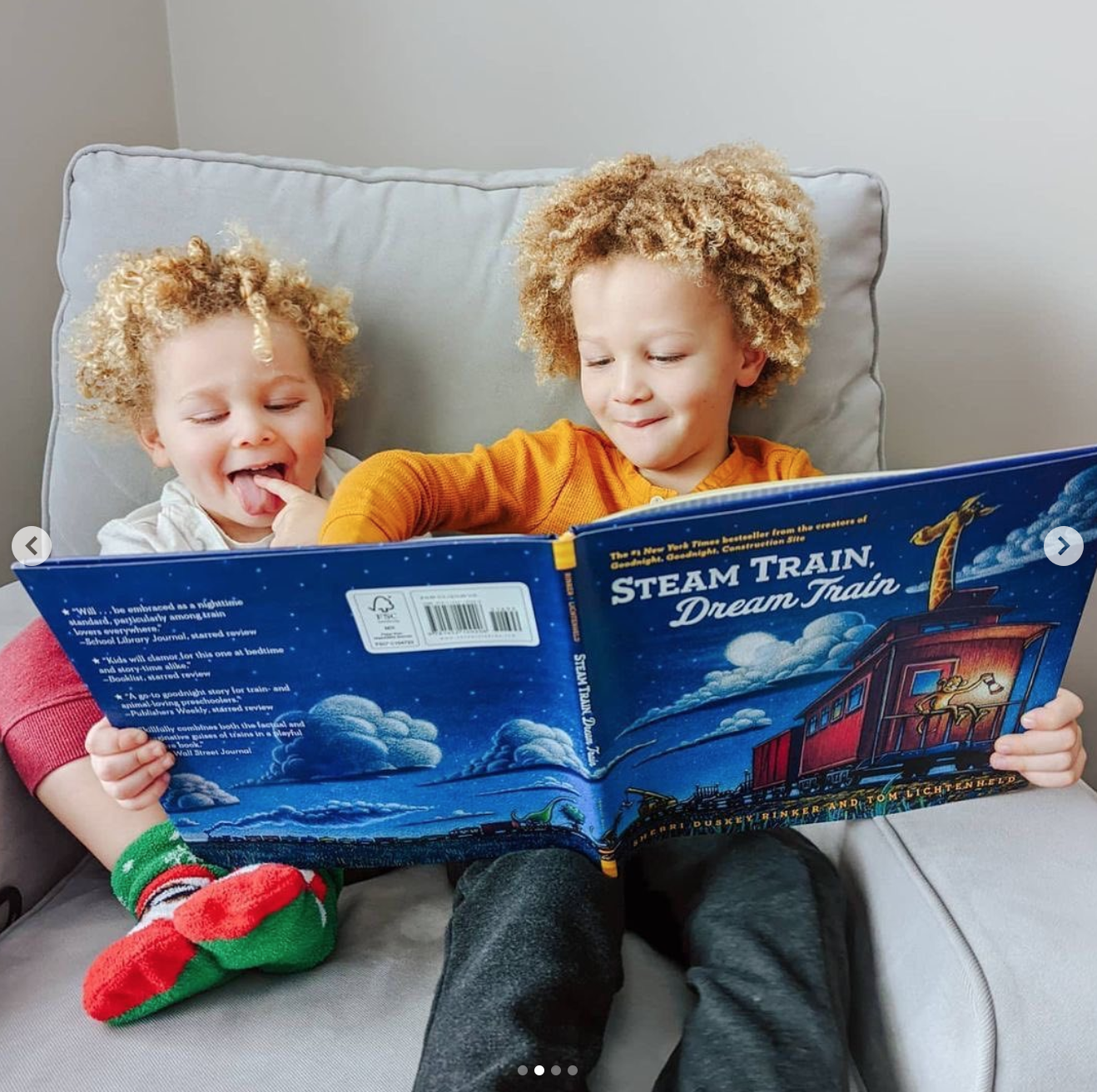 It's an older title (2013!) but LC has been getting into trains more so we added this one to the collection. Swipe ➡️ to see him opening it Christmas morning and catch him in the act of finger licking page turning 😝